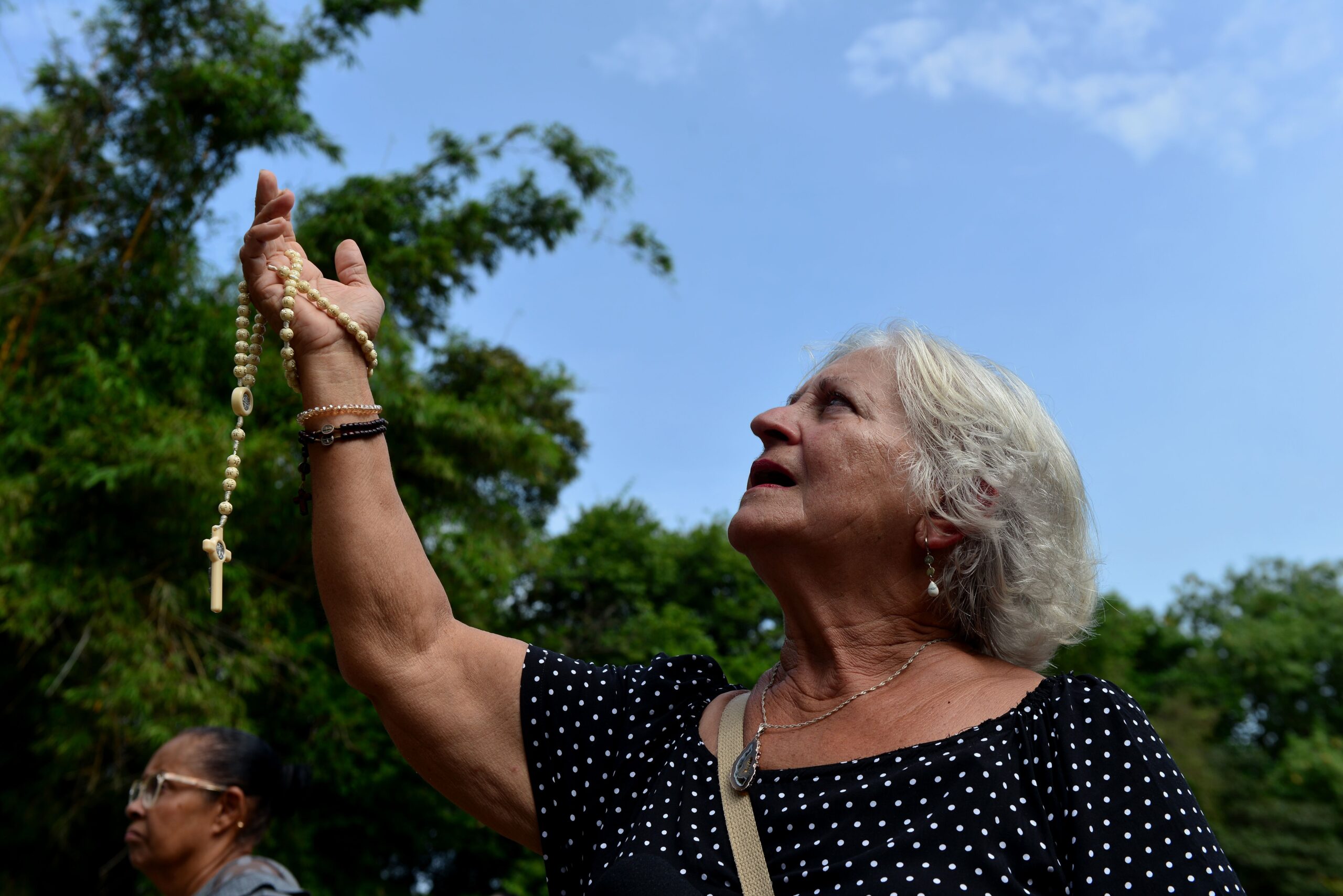 Inicialmente, a ideia era suspender o terço com balões de gás hélio, mas o peso impediu a execução. Naquele ano, as devotas o carregaram durante a Romaria das Mulheres, e depois, com a autorização de um frei, ele foi pendurado nas palmeiras do Convento. A tradição se manteve viva desde então.